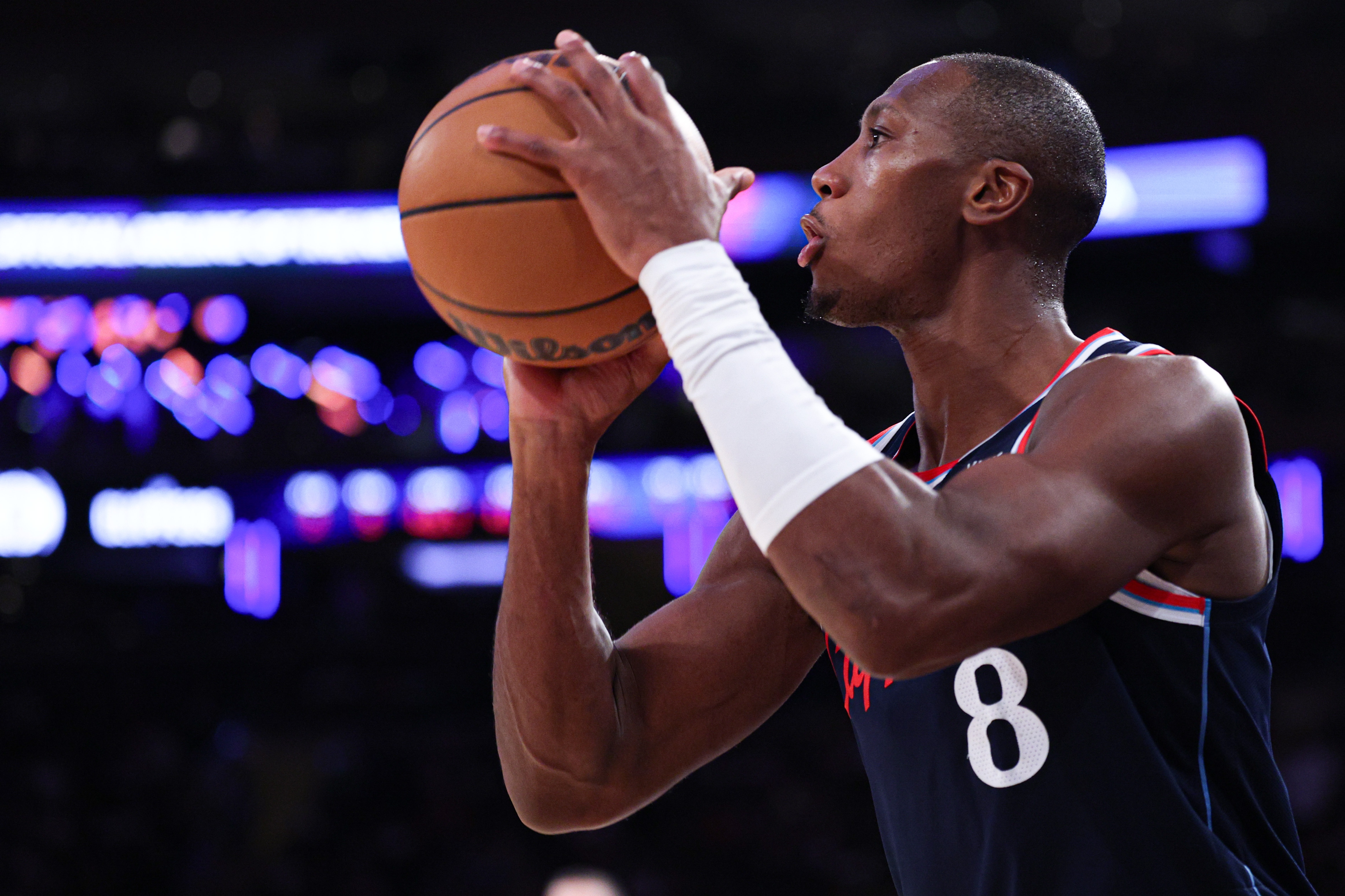 两队都不让持球王牌在挡拆中舒服,疯狂让角色球员进行大空位三分练习。