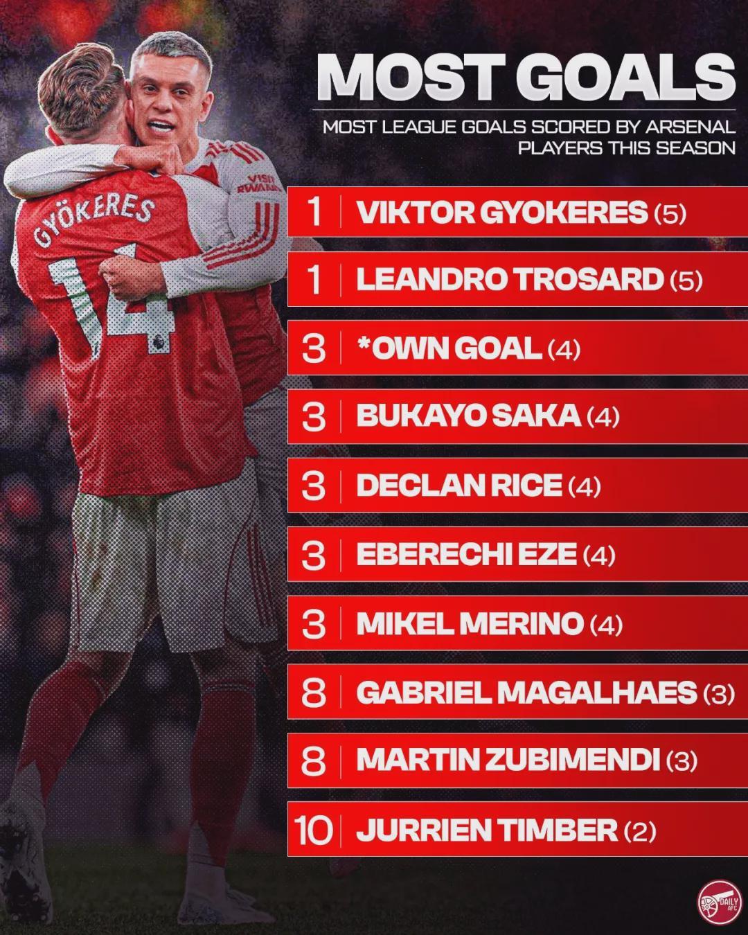 特罗萨德、哲凯赖什5球,赖斯、埃泽、梅里诺、萨卡、乌龙球4球,加布里埃尔、祖比门迪3球,廷贝尔2球。